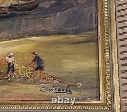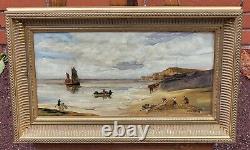 Il s'agit d'une peinture représentant une scène de bord de mer, avec des bateaux et des personnages le long du rivage. Technique : Peinture huile sur panneau de bois. Dimensions peinture huile sur panneau de bois hauteur 22 cm largeur 41 cm dimensions encadrement bois ancien dorée hauteur 32 cm largeur 50 cm profondeur.